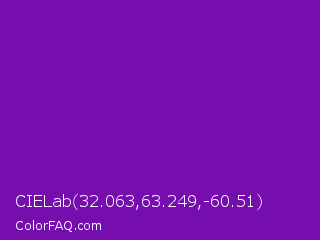 CIELab 32.063,63.249,-60.51 Color is a normal purple color and the nearest color is Violet RYB #8601af. Hex code #750ead and RGB value is rgb(117,14,173). In RGB color space, this color is composed of 46% red, 5% green, 68% blue, In CMYK color space, this color is composed of 32% cyan, 92% magenta, 0% yellow , 32% black , In HSL color space, this color has a hue angle of 279° , 85% saturation and 37% lightness.