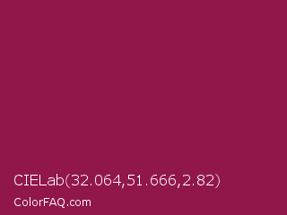 CIELab 32.064,51.666,2.82 Color is a normal rose color and the nearest color is Disco #871550. Hex code #911749 and RGB value is rgb(145,23,73). In RGB color space, this color is composed of 57% red, 9% green, 29% blue, In CMYK color space, this color is composed of 0% cyan, 84% magenta, 50% yellow , 43% black , In HSL color space, this color has a hue angle of 335° , 73% saturation and 33% lightness.