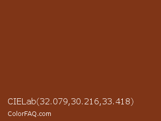 CIELab 32.079,30.216,33.418 Color is a dark orange color and the nearest color is Copper Canyon #7e3a15. Hex code #7f3517 and RGB value is rgb(127,53,23). In RGB color space, this color is composed of 50% red, 21% green, 9% blue, In CMYK color space, this color is composed of 0% cyan, 58% magenta, 82% yellow , 50% black , In HSL color space, this color has a hue angle of 17° , 69% saturation and 29% lightness.