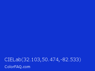 CIELab 32.103,50.474,-82.533 Color is a normal blue color and the nearest color is Persian Blue #1c39bb. Hex code #1033d2 and RGB value is rgb(16,51,210). In RGB color space, this color is composed of 6% red, 20% green, 82% blue, In CMYK color space, this color is composed of 92% cyan, 76% magenta, 0% yellow , 18% black , In HSL color space, this color has a hue angle of 229° , 86% saturation and 44% lightness.