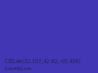 CIELab 32.107,42.82,-65.439 Color is a normal indigo color and the nearest color is Ocean Blue #4f42b5. Hex code #4236b5 and RGB value is rgb(66,54,181). In RGB color space, this color is composed of 26% red, 21% green, 71% blue, In CMYK color space, this color is composed of 64% cyan, 70% magenta, 0% yellow , 29% black , In HSL color space, this color has a hue angle of 246° , 54% saturation and 46% lightness.