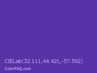 CIELab 32.111,44.421,-57.592 Color is a normal indigo color and the nearest color is Rebecca Purple #663399. Hex code #5732a8 and RGB value is rgb(87,50,168). In RGB color space, this color is composed of 34% red, 20% green, 66% blue, In CMYK color space, this color is composed of 48% cyan, 70% magenta, 0% yellow , 34% black , In HSL color space, this color has a hue angle of 259° , 54% saturation and 43% lightness.