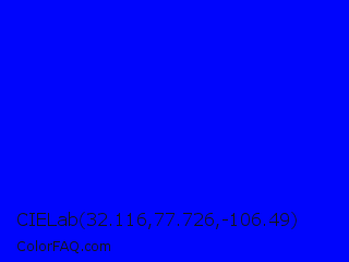CIELab 32.116,77.726,-106.49 Color is a normal blue color and the nearest color is Blue #0000ff. Hex code #0005fc and RGB value is rgb(0,5,252). In RGB color space, this color is composed of 0% red, 2% green, 99% blue, In CMYK color space, this color is composed of 100% cyan, 98% magenta, 0% yellow , 1% black , In HSL color space, this color has a hue angle of 239° , 100% saturation and 49% lightness.