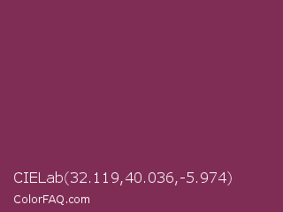 CIELab 32.119,40.036,-5.974 Color is a normal rose color and the nearest color is Dark Raspberry #872657. Hex code #802d56 and RGB value is rgb(128,45,86). In RGB color space, this color is composed of 50% red, 18% green, 34% blue, In CMYK color space, this color is composed of 0% cyan, 65% magenta, 33% yellow , 50% black , In HSL color space, this color has a hue angle of 330° , 48% saturation and 34% lightness.
