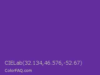 CIELab 32.134,46.576,-52.67 Color is a normal violet color and the nearest color is Rebecca Purple #663399. Hex code #632ea0 and RGB value is rgb(99,46,160). In RGB color space, this color is composed of 39% red, 18% green, 63% blue, In CMYK color space, this color is composed of 38% cyan, 71% magenta, 0% yellow , 37% black , In HSL color space, this color has a hue angle of 268° , 55% saturation and 40% lightness.
