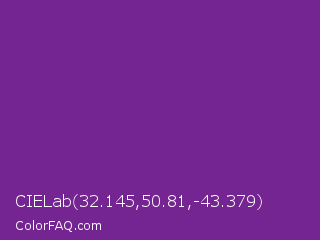 CIELab 32.145,50.81,-43.379 Color is a normal purple color and the nearest color is Seance #731e8f. Hex code #752591 and RGB value is rgb(117,37,145). In RGB color space, this color is composed of 46% red, 15% green, 57% blue, In CMYK color space, this color is composed of 19% cyan, 74% magenta, 0% yellow , 43% black , In HSL color space, this color has a hue angle of 284° , 59% saturation and 36% lightness.