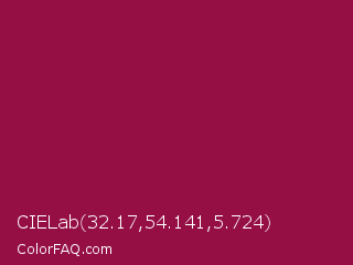CIELab 32.17,54.141,5.724 Color is a normal rose color and the nearest color is Disco #871550. Hex code #950f45 and RGB value is rgb(149,15,69). In RGB color space, this color is composed of 58% red, 6% green, 27% blue, In CMYK color space, this color is composed of 0% cyan, 90% magenta, 54% yellow , 42% black , In HSL color space, this color has a hue angle of 336° , 82% saturation and 32% lightness.