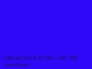CIELab 32.18,75.362,-100.708 Color is a normal indigo color and the nearest color is Electric Ultramarine #3f00ff. Hex code #2e08f2 and RGB value is rgb(46,8,242). In RGB color space, this color is composed of 18% red, 3% green, 95% blue, In CMYK color space, this color is composed of 81% cyan, 97% magenta, 0% yellow , 5% black , In HSL color space, this color has a hue angle of 250° , 94% saturation and 49% lightness.