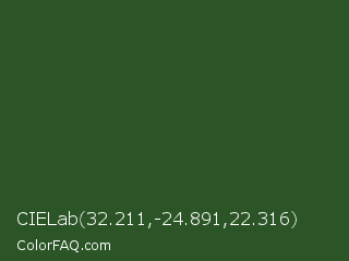 CIELab 32.211,-24.891,22.316 Color is a dark green color and the nearest color is Mughal Green #306030. Hex code #2c5527 and RGB value is rgb(44,85,39). In RGB color space, this color is composed of 17% red, 33% green, 15% blue, In CMYK color space, this color is composed of 48% cyan, 0% magenta, 54% yellow , 67% black , In HSL color space, this color has a hue angle of 113° , 37% saturation and 24% lightness.