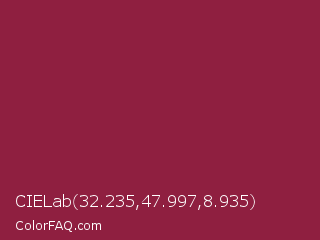 CIELab 32.235,47.997,8.935 Color is a normal rose color and the nearest color is Big Dip O Ruby #9c2542. Hex code #8f1f40 and RGB value is rgb(143,31,64). In RGB color space, this color is composed of 56% red, 12% green, 25% blue, In CMYK color space, this color is composed of 0% cyan, 78% magenta, 55% yellow , 44% black , In HSL color space, this color has a hue angle of 342° , 64% saturation and 34% lightness.