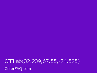 CIELab 32.239,67.55,-74.525 Color is a normal violet color and the nearest color is French Violet #8806ce. Hex code #680ac5 and RGB value is rgb(104,10,197). In RGB color space, this color is composed of 41% red, 4% green, 77% blue, In CMYK color space, this color is composed of 47% cyan, 95% magenta, 0% yellow , 23% black , In HSL color space, this color has a hue angle of 270° , 90% saturation and 41% lightness.