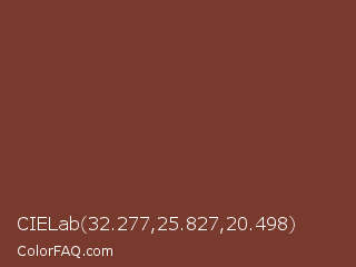 CIELab 32.277,25.827,20.498 Color is a normal red color and the nearest color is Nutmeg #81422c. Hex code #783a2d and RGB value is rgb(120,58,45). In RGB color space, this color is composed of 47% red, 23% green, 18% blue, In CMYK color space, this color is composed of 0% cyan, 52% magenta, 63% yellow , 53% black , In HSL color space, this color has a hue angle of 10° , 45% saturation and 32% lightness.