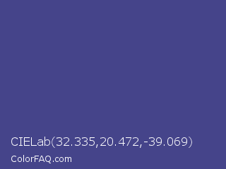 CIELab 32.335,20.472,-39.069 Color is a normal indigo color and the nearest color is Dark Slate Blue #483d8b. Hex code #45448a and RGB value is rgb(69,68,138). In RGB color space, this color is composed of 27% red, 27% green, 54% blue, In CMYK color space, this color is composed of 50% cyan, 51% magenta, 0% yellow , 46% black , In HSL color space, this color has a hue angle of 241° , 34% saturation and 40% lightness.