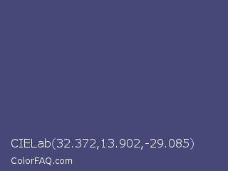 CIELab 32.372,13.902,-29.085 Color is a normal blue color and the nearest color is East Bay #414c7d. Hex code #47477a and RGB value is rgb(71,71,122). In RGB color space, this color is composed of 28% red, 28% green, 48% blue, In CMYK color space, this color is composed of 42% cyan, 42% magenta, 0% yellow , 52% black , In HSL color space, this color has a hue angle of 240° , 26% saturation and 38% lightness.
