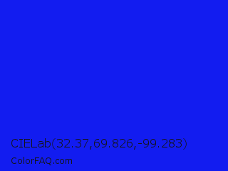 CIELab 32.37,69.826,-99.283 Color is a normal blue color and the nearest color is Bluebonnet #1c1cf0. Hex code #121cf0 and RGB value is rgb(18,28,240). In RGB color space, this color is composed of 7% red, 11% green, 94% blue, In CMYK color space, this color is composed of 93% cyan, 88% magenta, 0% yellow , 6% black , In HSL color space, this color has a hue angle of 237° , 88% saturation and 51% lightness.