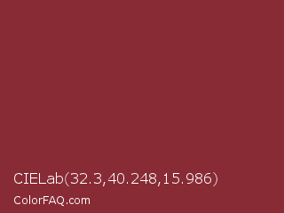 CIELab 32.3,40.248,15.986 Color is a normal red color and the nearest color is Antique Ruby #841b2d. Hex code #882b35 and RGB value is rgb(136,43,53). In RGB color space, this color is composed of 53% red, 17% green, 21% blue, In CMYK color space, this color is composed of 0% cyan, 68% magenta, 61% yellow , 47% black , In HSL color space, this color has a hue angle of 354° , 52% saturation and 35% lightness.