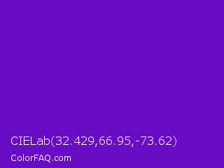 CIELab 32.429,66.95,-73.62 Color is a normal violet color and the nearest color is Purple Heart Crayola #652dc1. Hex code #690dc4 and RGB value is rgb(105,13,196). In RGB color space, this color is composed of 41% red, 5% green, 77% blue, In CMYK color space, this color is composed of 46% cyan, 93% magenta, 0% yellow , 23% black , In HSL color space, this color has a hue angle of 270° , 88% saturation and 41% lightness.