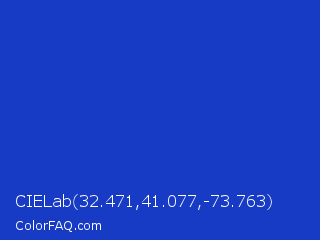 CIELab 32.471,41.077,-73.763 Color is a normal blue color and the nearest color is Persian Blue #1c39bb. Hex code #173bc4 and RGB value is rgb(23,59,196). In RGB color space, this color is composed of 9% red, 23% green, 77% blue, In CMYK color space, this color is composed of 88% cyan, 70% magenta, 0% yellow , 23% black , In HSL color space, this color has a hue angle of 228° , 79% saturation and 43% lightness.