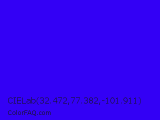 CIELab 32.472,77.382,-101.911 Color is a normal indigo color and the nearest color is Electric Ultramarine #3f00ff. Hex code #3300f5 and RGB value is rgb(51,0,245). In RGB color space, this color is composed of 20% red, 0% green, 96% blue, In CMYK color space, this color is composed of 79% cyan, 100% magenta, 0% yellow , 4% black , In HSL color space, this color has a hue angle of 252° , 100% saturation and 48% lightness.