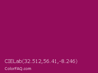 CIELab 32.512,56.41,-8.246 Color is a normal magenta color and the nearest color is Cardinal Pink #8c055e. Hex code #940c5b and RGB value is rgb(148,12,91). In RGB color space, this color is composed of 58% red, 5% green, 36% blue, In CMYK color space, this color is composed of 0% cyan, 92% magenta, 39% yellow , 42% black , In HSL color space, this color has a hue angle of 325° , 85% saturation and 31% lightness.