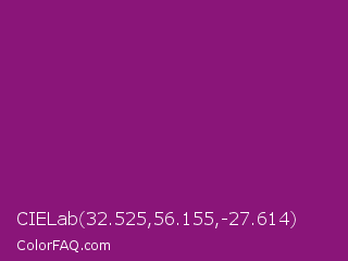 CIELab 32.525,56.155,-27.614 Color is a normal magenta color and the nearest color is Mardi Gras #880085. Hex code #8a1579 and RGB value is rgb(138,21,121). In RGB color space, this color is composed of 54% red, 8% green, 47% blue, In CMYK color space, this color is composed of 0% cyan, 85% magenta, 12% yellow , 46% black , In HSL color space, this color has a hue angle of 309° , 74% saturation and 31% lightness.