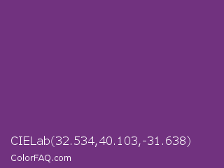 CIELab 32.534,40.103,-31.638 Color is a normal purple color and the nearest color is Maximum Purple #733380. Hex code #71327f and RGB value is rgb(113,50,127). In RGB color space, this color is composed of 44% red, 20% green, 50% blue, In CMYK color space, this color is composed of 11% cyan, 61% magenta, 0% yellow , 50% black , In HSL color space, this color has a hue angle of 289° , 44% saturation and 35% lightness.