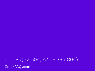 CIELab 32.584,72.08,-86.804 Color is a normal violet color and the nearest color is Han Purple #5218fa. Hex code #5905db and RGB value is rgb(89,5,219). In RGB color space, this color is composed of 35% red, 2% green, 86% blue, In CMYK color space, this color is composed of 59% cyan, 98% magenta, 0% yellow , 14% black , In HSL color space, this color has a hue angle of 264° , 96% saturation and 44% lightness.