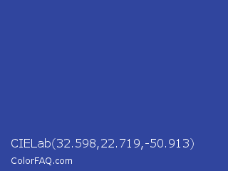 CIELab 32.598,22.719,-50.913 Color is a normal blue color and the nearest color is Sapphire #2f519e. Hex code #30459e and RGB value is rgb(48,69,158). In RGB color space, this color is composed of 19% red, 27% green, 62% blue, In CMYK color space, this color is composed of 70% cyan, 56% magenta, 0% yellow , 38% black , In HSL color space, this color has a hue angle of 229° , 53% saturation and 40% lightness.