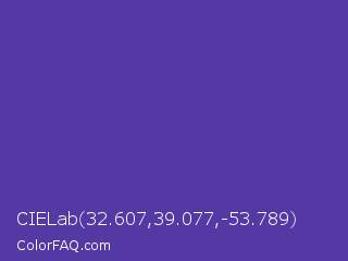 CIELab 32.607,39.077,-53.789 Color is a normal indigo color and the nearest color is Gigas #523c94. Hex code #5438a3 and RGB value is rgb(84,56,163). In RGB color space, this color is composed of 33% red, 22% green, 64% blue, In CMYK color space, this color is composed of 48% cyan, 66% magenta, 0% yellow , 36% black , In HSL color space, this color has a hue angle of 256° , 49% saturation and 43% lightness.