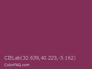 CIELab 32.639,40.223,-5.162 Color is a normal rose color and the nearest color is Camelot #893456. Hex code #822e56 and RGB value is rgb(130,46,86). In RGB color space, this color is composed of 51% red, 18% green, 34% blue, In CMYK color space, this color is composed of 0% cyan, 65% magenta, 34% yellow , 49% black , In HSL color space, this color has a hue angle of 331° , 48% saturation and 35% lightness.