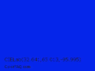 CIELab 32.641,65.013,-95.995 Color is a normal blue color and the nearest color is Bluebonnet #1c1cf0. Hex code #0825eb and RGB value is rgb(8,37,235). In RGB color space, this color is composed of 3% red, 15% green, 92% blue, In CMYK color space, this color is composed of 97% cyan, 84% magenta, 0% yellow , 8% black , In HSL color space, this color has a hue angle of 232° , 93% saturation and 48% lightness.