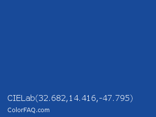 CIELab 32.682,14.416,-47.795 Color is a normal blue color and the nearest color is Yale Blue #0f4d92. Hex code #184a99 and RGB value is rgb(24,74,153). In RGB color space, this color is composed of 9% red, 29% green, 60% blue, In CMYK color space, this color is composed of 84% cyan, 52% magenta, 0% yellow , 40% black , In HSL color space, this color has a hue angle of 217° , 73% saturation and 35% lightness.