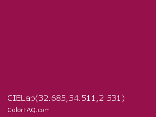 CIELab 32.685,54.511,2.531 Color is a normal rose color and the nearest color is Disco #871550. Hex code #96114b and RGB value is rgb(150,17,75). In RGB color space, this color is composed of 59% red, 7% green, 29% blue, In CMYK color space, this color is composed of 0% cyan, 89% magenta, 50% yellow , 41% black , In HSL color space, this color has a hue angle of 334° , 80% saturation and 33% lightness.