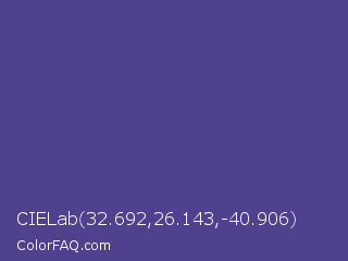 CIELab 32.692,26.143,-40.906 Color is a normal indigo color and the nearest color is Victoria #534491. Hex code #4f418e and RGB value is rgb(79,65,142). In RGB color space, this color is composed of 31% red, 25% green, 56% blue, In CMYK color space, this color is composed of 44% cyan, 54% magenta, 0% yellow , 44% black , In HSL color space, this color has a hue angle of 251° , 37% saturation and 41% lightness.