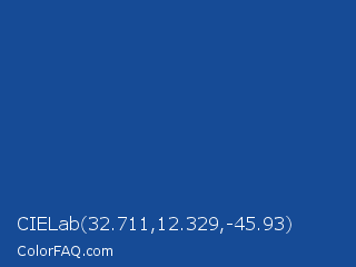 CIELab 32.711,12.329,-45.93 Color is a normal blue color and the nearest color is Yale Blue #0f4d92. Hex code #164b96 and RGB value is rgb(22,75,150). In RGB color space, this color is composed of 9% red, 29% green, 59% blue, In CMYK color space, this color is composed of 85% cyan, 50% magenta, 0% yellow , 41% black , In HSL color space, this color has a hue angle of 215° , 74% saturation and 34% lightness.