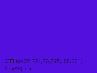 CIELab 32.721,70.795,-88.324 Color is a normal indigo color and the nearest color is Han Purple #5218fa. Hex code #520fde and RGB value is rgb(82,15,222). In RGB color space, this color is composed of 32% red, 6% green, 87% blue, In CMYK color space, this color is composed of 63% cyan, 93% magenta, 0% yellow , 13% black , In HSL color space, this color has a hue angle of 259° , 87% saturation and 46% lightness.
