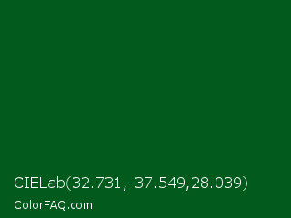 CIELab 32.731,-37.549,28.039 Color is a very dark green color and the nearest color is Camarone #00581a. Hex code #025a1d and RGB value is rgb(2,90,29). In RGB color space, this color is composed of 1% red, 35% green, 11% blue, In CMYK color space, this color is composed of 98% cyan, 0% magenta, 68% yellow , 65% black , In HSL color space, this color has a hue angle of 138° , 96% saturation and 18% lightness.