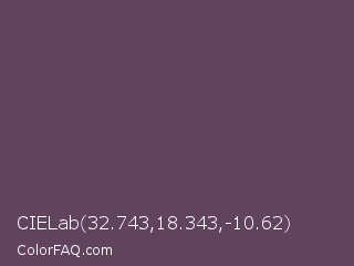 CIELab 32.743,18.343,-10.62 Color is a normal magenta color and the nearest color is Eggplant #614051. Hex code #62435e and RGB value is rgb(98,67,94). In RGB color space, this color is composed of 38% red, 26% green, 37% blue, In CMYK color space, this color is composed of 0% cyan, 32% magenta, 4% yellow , 62% black , In HSL color space, this color has a hue angle of 308° , 19% saturation and 32% lightness.