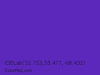 CIELab 32.753,55.477,-68.432 Color is a normal violet color and the nearest color is Purple Heart Crayola #652dc1. Hex code #5c28bc and RGB value is rgb(92,40,188). In RGB color space, this color is composed of 36% red, 16% green, 74% blue, In CMYK color space, this color is composed of 51% cyan, 79% magenta, 0% yellow , 26% black , In HSL color space, this color has a hue angle of 261° , 65% saturation and 45% lightness.