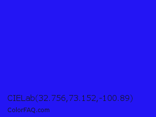 CIELab 32.756,73.152,-100.89 Color is a normal indigo color and the nearest color is Bluebonnet #1c1cf0. Hex code #2315f4 and RGB value is rgb(35,21,244). In RGB color space, this color is composed of 14% red, 8% green, 96% blue, In CMYK color space, this color is composed of 86% cyan, 91% magenta, 0% yellow , 4% black , In HSL color space, this color has a hue angle of 244° , 91% saturation and 52% lightness.