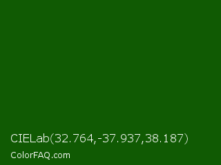 CIELab 32.764,-37.937,38.187 Color is a very dark green color and the nearest color is Lincoln Green #195905. Hex code #105a03 and RGB value is rgb(16,90,3). In RGB color space, this color is composed of 6% red, 35% green, 1% blue, In CMYK color space, this color is composed of 82% cyan, 0% magenta, 97% yellow , 65% black , In HSL color space, this color has a hue angle of 111° , 94% saturation and 18% lightness.