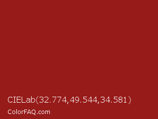 CIELab 32.774,49.544,34.581 Color is a normal red color and the nearest color is Tamarillo #991613. Hex code #971b19 and RGB value is rgb(151,27,25). In RGB color space, this color is composed of 59% red, 11% green, 10% blue, In CMYK color space, this color is composed of 0% cyan, 82% magenta, 83% yellow , 41% black , In HSL color space, this color has a hue angle of 1° , 72% saturation and 35% lightness.