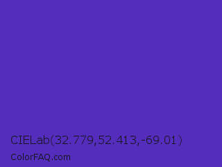 CIELab 32.779,52.413,-69.01 Color is a normal indigo color and the nearest color is Purple Heart Crayola #652dc1. Hex code #542dbd and RGB value is rgb(84,45,189). In RGB color space, this color is composed of 33% red, 18% green, 74% blue, In CMYK color space, this color is composed of 56% cyan, 76% magenta, 0% yellow , 26% black , In HSL color space, this color has a hue angle of 256° , 62% saturation and 46% lightness.