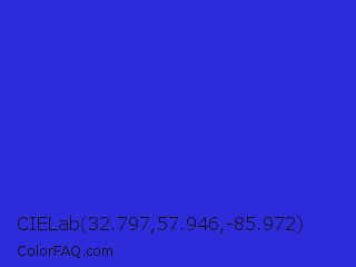 CIELab 32.797,57.946,-85.972 Color is a normal indigo color and the nearest color is Palatinate Blue #273be2. Hex code #2e2cda and RGB value is rgb(46,44,218). In RGB color space, this color is composed of 18% red, 17% green, 85% blue, In CMYK color space, this color is composed of 79% cyan, 80% magenta, 0% yellow , 15% black , In HSL color space, this color has a hue angle of 241° , 70% saturation and 51% lightness.