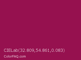 CIELab 32.809,54.861,0.083 Color is a normal rose color and the nearest color is Disco #871550. Hex code #96114f and RGB value is rgb(150,17,79). In RGB color space, this color is composed of 59% red, 7% green, 31% blue, In CMYK color space, this color is composed of 0% cyan, 89% magenta, 47% yellow , 41% black , In HSL color space, this color has a hue angle of 332° , 80% saturation and 33% lightness.