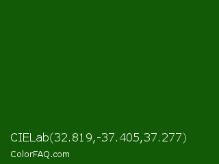 CIELab 32.819,-37.405,37.277 Color is a very dark green color and the nearest color is Lincoln Green #195905. Hex code #125a06 and RGB value is rgb(18,90,6). In RGB color space, this color is composed of 7% red, 35% green, 2% blue, In CMYK color space, this color is composed of 80% cyan, 0% magenta, 93% yellow , 65% black , In HSL color space, this color has a hue angle of 111° , 88% saturation and 19% lightness.