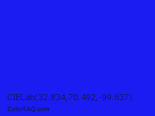 CIELab 32.834,70.492,-99.637 Color is a normal blue color and the nearest color is Bluebonnet #1c1cf0. Hex code #1a1cf2 and RGB value is rgb(26,28,242). In RGB color space, this color is composed of 10% red, 11% green, 95% blue, In CMYK color space, this color is composed of 89% cyan, 88% magenta, 0% yellow , 5% black , In HSL color space, this color has a hue angle of 239° , 89% saturation and 53% lightness.
