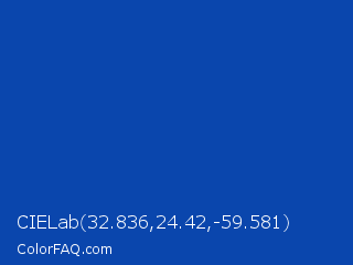CIELab 32.836,24.42,-59.581 Color is a normal blue color and the nearest color is Cobalt #0047ab. Hex code #0a46ad and RGB value is rgb(10,70,173). In RGB color space, this color is composed of 4% red, 27% green, 68% blue, In CMYK color space, this color is composed of 94% cyan, 60% magenta, 0% yellow , 32% black , In HSL color space, this color has a hue angle of 218° , 89% saturation and 36% lightness.