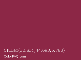 CIELab 32.851,44.693,5.783 Color is a normal rose color and the nearest color is Big Dip O Ruby #9c2542. Hex code #8c2746 and RGB value is rgb(140,39,70). In RGB color space, this color is composed of 55% red, 15% green, 27% blue, In CMYK color space, this color is composed of 0% cyan, 72% magenta, 50% yellow , 45% black , In HSL color space, this color has a hue angle of 342° , 56% saturation and 35% lightness.