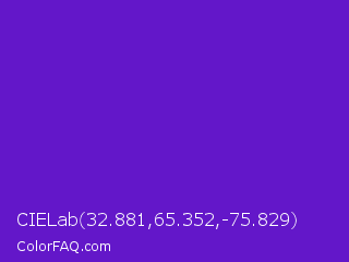 CIELab 32.881,65.352,-75.829 Color is a normal violet color and the nearest color is Purple Heart Crayola #652dc1. Hex code #6317c9 and RGB value is rgb(99,23,201). In RGB color space, this color is composed of 39% red, 9% green, 79% blue, In CMYK color space, this color is composed of 51% cyan, 89% magenta, 0% yellow , 21% black , In HSL color space, this color has a hue angle of 266° , 79% saturation and 44% lightness.